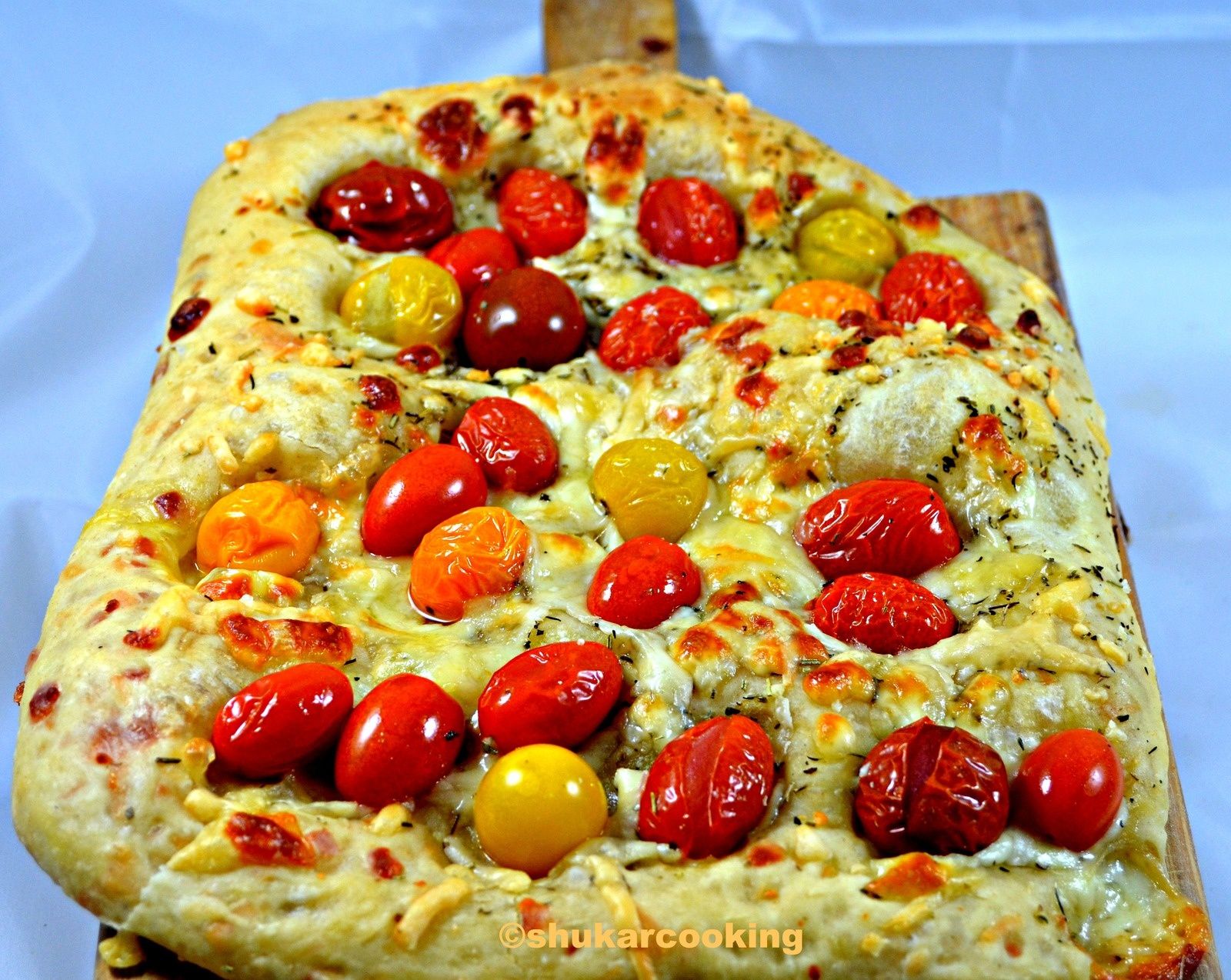 Parsemer d’herbes de Provences, repartir les tomates cerise et parsemer de fromage râpé.